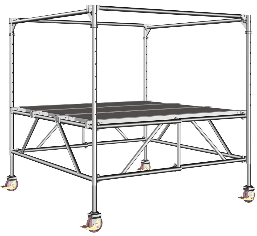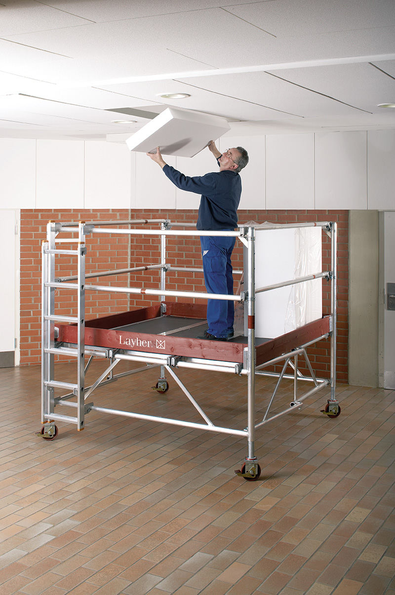 Der Staro Rollbock ist das „Fertiggerüst“ mit dem großen Arbeitsboden. Es ist unverzichtbar für zügiges Bearbeiten großer Deckenflächen oder für Montagen von Bauteilen oder Installationen unter der Decke.