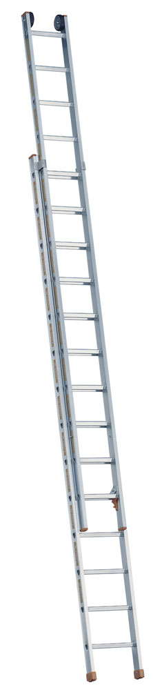 Zweiteilige Schiebeleiter mit verstärkten Holmen für größere Höhen und stärkere Belastungen, mit kurzen Transport- und Lagermaßen. Mit Kopffahrwerk zum einfachen Ausfahren an der Fassade. Sprossenweise manuelle Längeneinstellung durch Aufsetzhaken, Sicherung gegen Ausheben und Ausschieben beim Transport und in Gebrauchsstellung. Ober- und Unterleiter sind bei demontiertem Kopffahrwerk getrennt verwendbar.