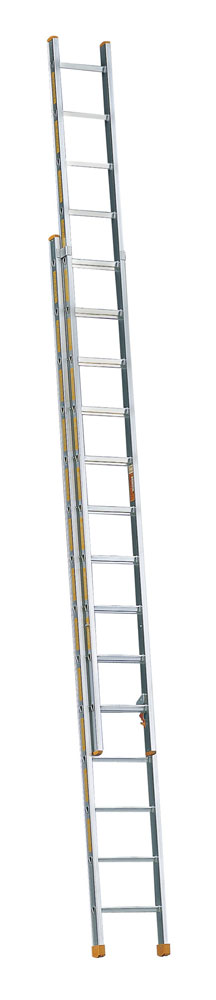 Zweiteilige Schiebeleiter mit verstärkten Holmen für größere Höhen und stärkere Belastungen, mit kurzen Transport- und Lagermaßen. Sprossenweise manuelle Längeneinstellung durch Aufsetzhaken, Sicherung gegen Ausheben und Ausschieben beim Transport und in Gebrauchsstellung.