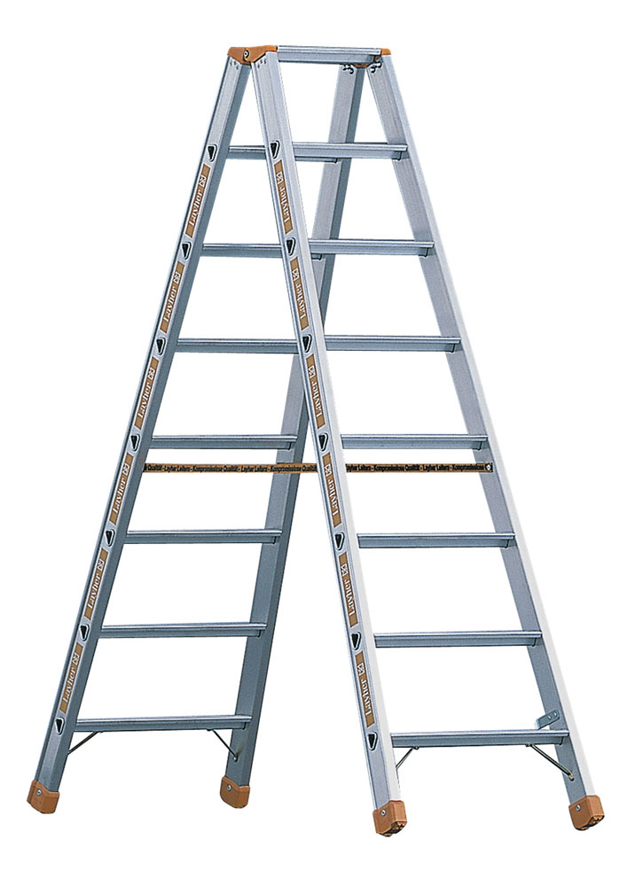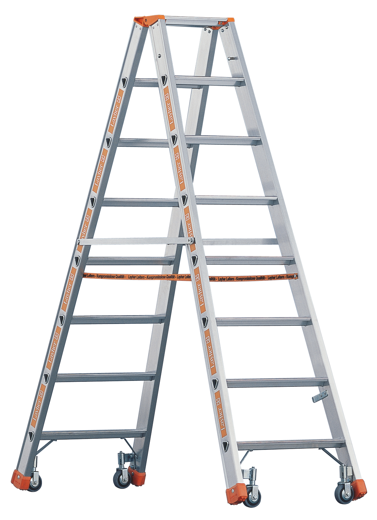 Die klassische Ausführung der Stehleiter mit bequemen breiten Stufen. Kunststoffummantelte Stahlscharniere, Verstärkungswinkel und reißfeste Polyester-Gurtbänder sind Qualitätsmerkmale. Beide oberen Stufen bilden gemeinsam eine Plattform.